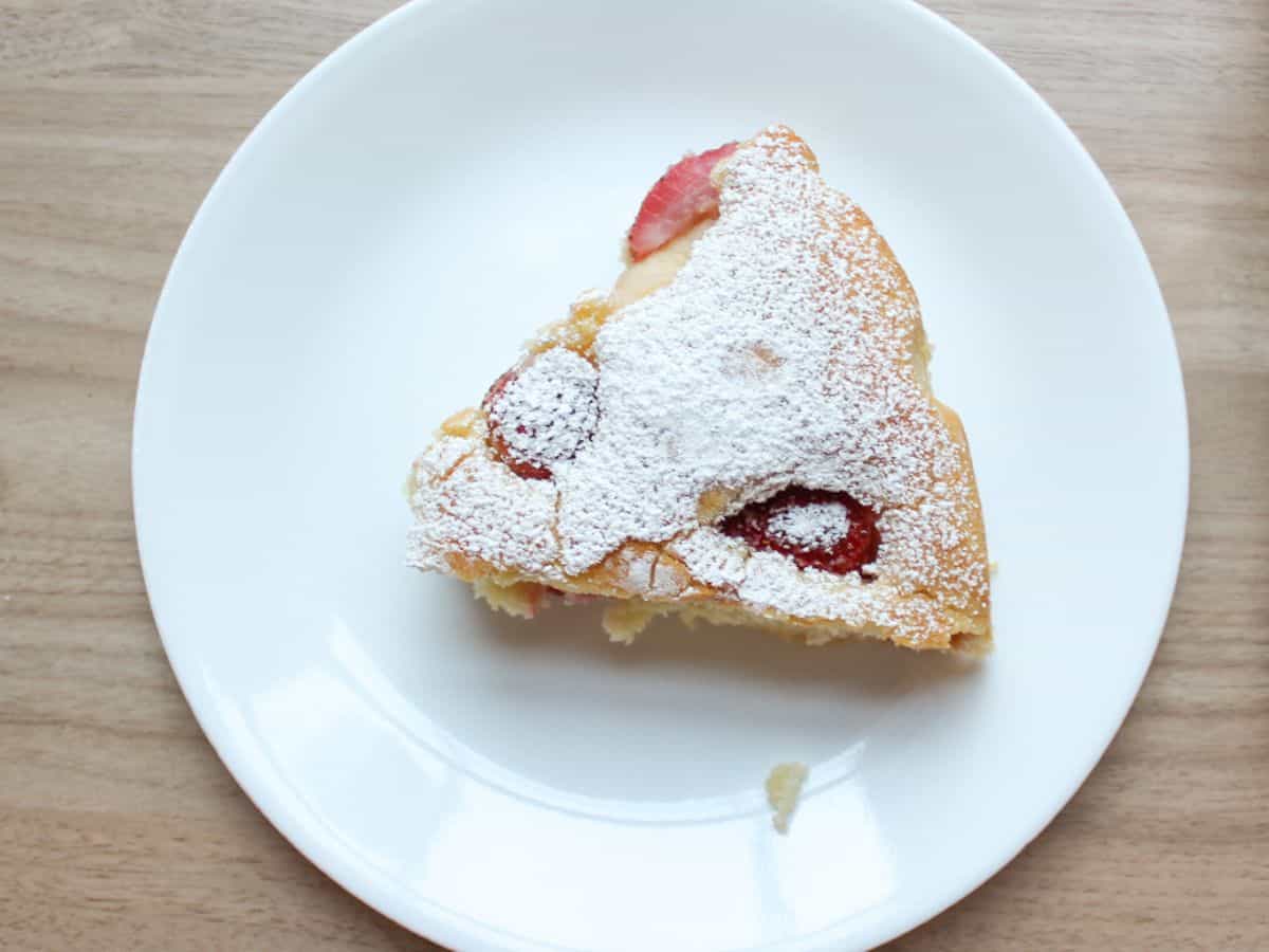 A slice of soft strawberry cake dusted with powdered sugar, with fresh strawberries baked inside.